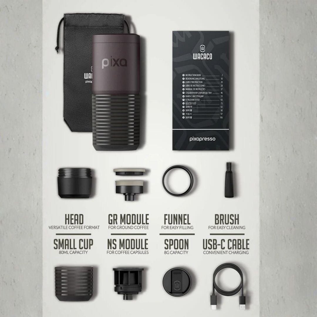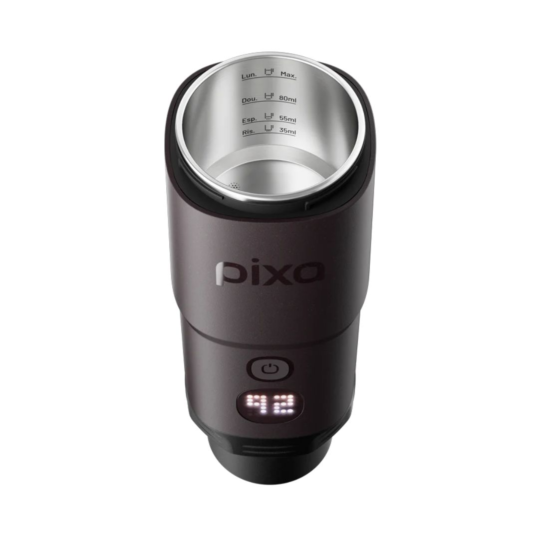 La Pixapresso es la primera máquina de espresso portátil eléctrica de Wacaco, diseñada para los amantes del espresso que se niegan a comprometer la comodidad, sin importar dónde se encuentren. Con su diseño elegante y su pantalla intuitiva, la Pixapresso le permite controlar fácilmente los ajustes clave de la extracción, como la temperatura del agua y la preinfusión, ofreciendo así una personalización de nivel barista directamente al alcance de su mano. Ya sea que prepare un espresso con café recién molido gracias al filtro ajustable o que disfrute de la comodidad de las cápsulas de café, la Pixapresso adapta cada taza a sus preferencias. Perfecta para el hogar, la oficina o aventuras al aire libre, ofrece una experiencia de espresso excepcional en cualquier momento y lugar, satisfaciendo tanto a los bebedores ocasionales como a los conocedores exigentes del café.
