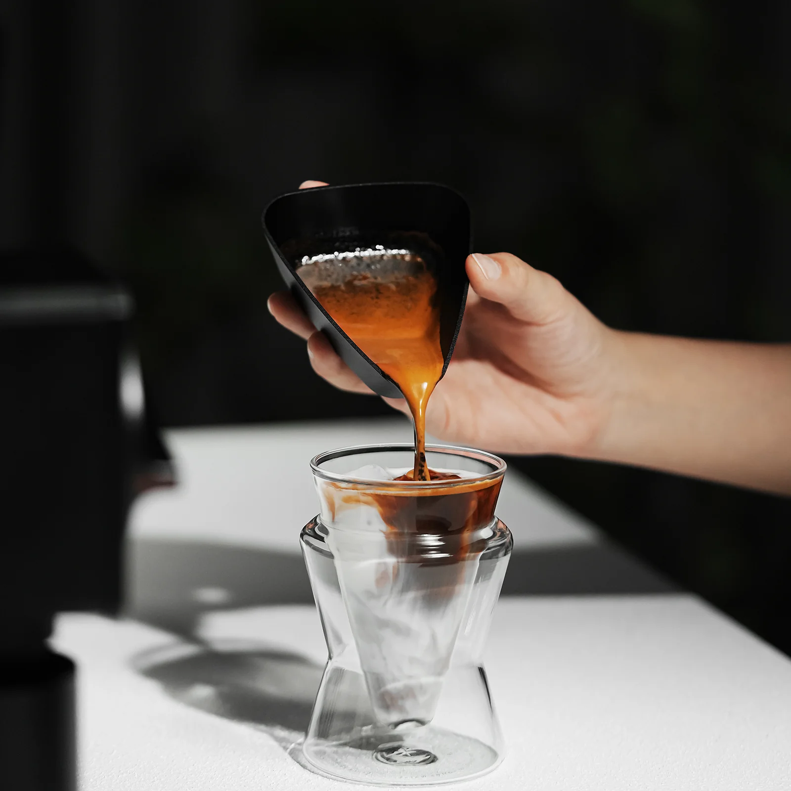 Inspirado en la proporción áurea, el diseño triangular simétrico de este dosing cup no solo ofrece una estética visualmente equilibrada, sino también una ergonomía superior, brindando comodidad y control en cada uso.