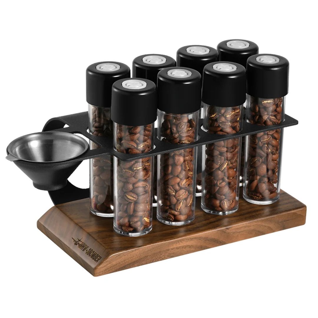 Juego de tubos para café con cierre hermético degacificador MHW-3BOMBER, 8 unidades con stand y dosificador