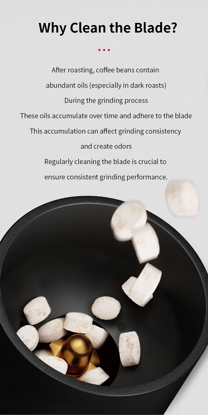 Elimina aceites de café y partículas de molienda del interior del molinillo sin necesidad de desarmarlo.