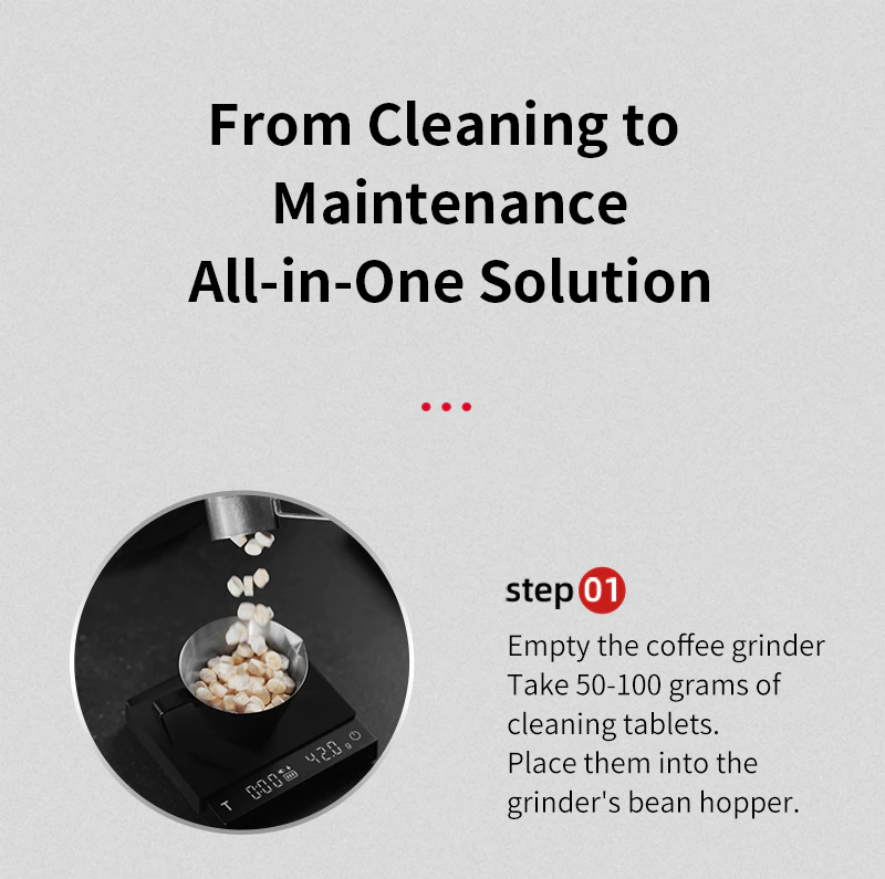 Agregar las tabletas de limpieza: usar 1 frasco (35–40 g) para molinillos de espresso o 2 tapas (70–80 g) para molinillos de tienda.